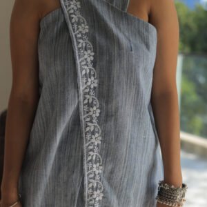 Celebrate elegance with a touch of tradition with the Mahanadi Wrap Top. Crafted from soft, breathable cotton, this sleeveless white wrap top is a tribute to minimalist sophistication. Adorned with delicate hand-embroidered floral patterns in warm hues of orange and green, it exudes the charm of artisanal craftsmanship.