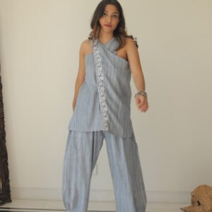 Elevate your everyday wardrobe with the Everest Mist Co-ord Set, a chic ensemble crafted from cotton. This grey-striped set combines effortless style and comfort, featuring an asymmetrical wrap top adorned with delicate white embroidered details for a touch of elegance. The relaxed-fit pants add fluidity to the look, making it perfect for all-day wear.