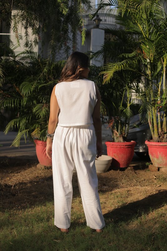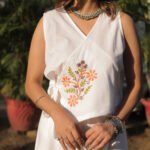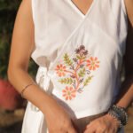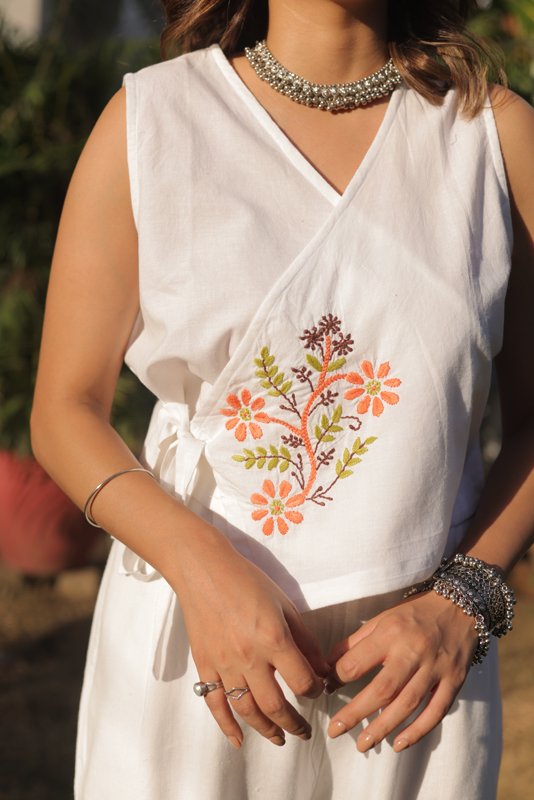 Celebrate elegance with a touch of tradition with the Mahanadi Wrap Top. Crafted from soft, breathable cotton, this sleeveless white wrap top is a tribute to minimalist sophistication. Adorned with delicate hand-embroidered floral patterns in warm hues of orange and green, it exudes the charm of artisanal craftsmanship.