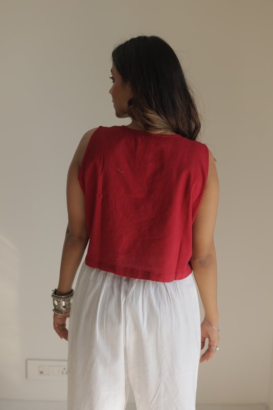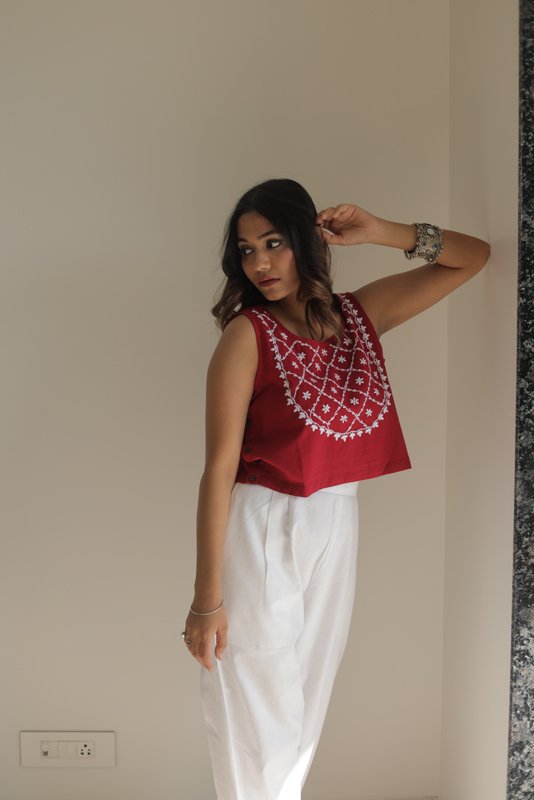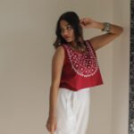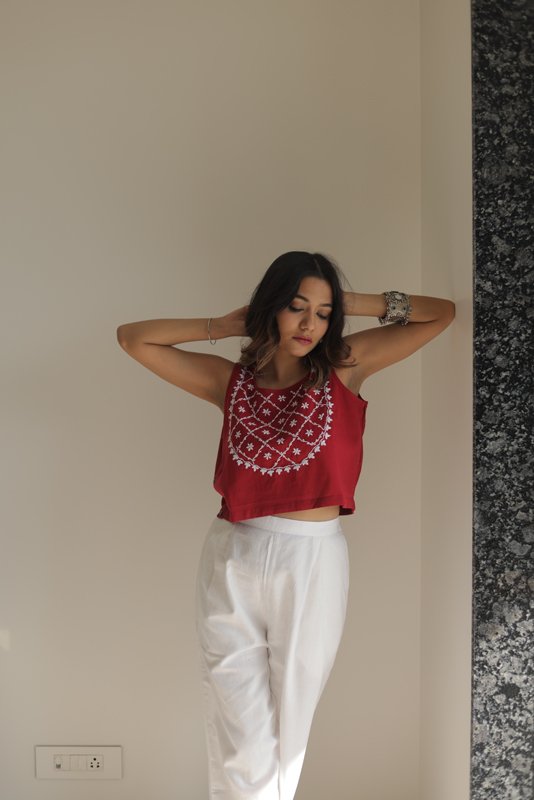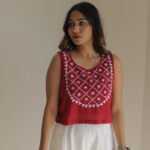 Celebrate elegance with a touch of tradition with the Mahanadi Wrap Top. Crafted from soft, breathable cotton, this sleeveless white wrap top is a tribute to minimalist sophistication. Adorned with delicate hand-embroidered floral patterns in warm hues of orange and green, it exudes the charm of artisanal craftsmanship.