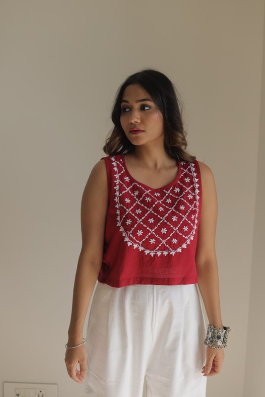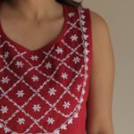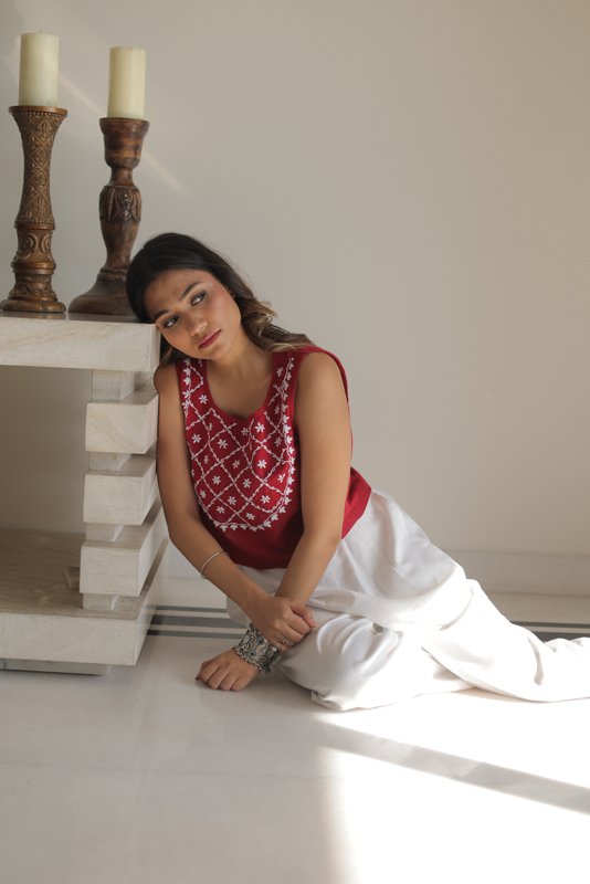 This elegant sleeveless white top is crafted from lightweight, breathable fabric, making it an ideal choice for warm-weather wear. The highlight of this piece is its intricate tepchi embroidery, a traditional hand-embroidery technique known for its fine, linear floral patterns. This exquisite detailing adds a touch of cultural richness and sophistication, perfectly blending heritage with modern charm. The round neckline enhances its classic appeal, while the tailored fit ensures all-day comfort.