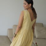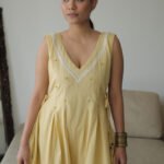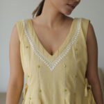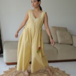 Brighten your wardrobe with the Shivalik Sunshine Jumpsuit in subtle yellow. Featuring a relaxed, flowy silhouette with delicate pleats and a V-neckline adorned with intricate embroidery, it blends elegance with comfort.