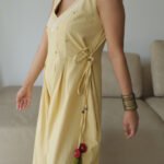 Side ties with handcrafted tassels add a playful touch and adjustable fit, making it perfect for casual outings or serene gatherings. Celebrate timeless style with this versatile, charming piece.